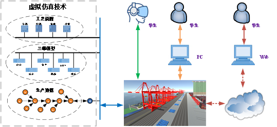 本实验以上海港洋山四期全自动化集装箱码头为仿真对象,将码头真实的历史生产数据接入港口虚拟场景,采用虚拟现实(VR)技术再现智慧港口物流系统生产过程,允许学生采用多种交互方式学习智慧港口管理知识,设定生产组织与管理任务,由实验系统对学生实验操作进行考查并打分。本实验支持VR头盔、PC版以及Web版等多种环境下开展虚拟仿真实验,既能够满足线上共享实验,同时又能够满足有条件的院校开展高沉浸感的实验方式。