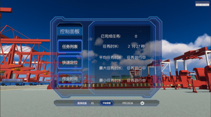 步骤十一:查看当前进口卸船作业完成情况,界面如图8所示,实时显示当前完成作业任务的个数以及单个任务完成所需要的时间、当前作业的总时间等数据,使学生了解和掌握码头作业计划和调度对作业效率的影响。
