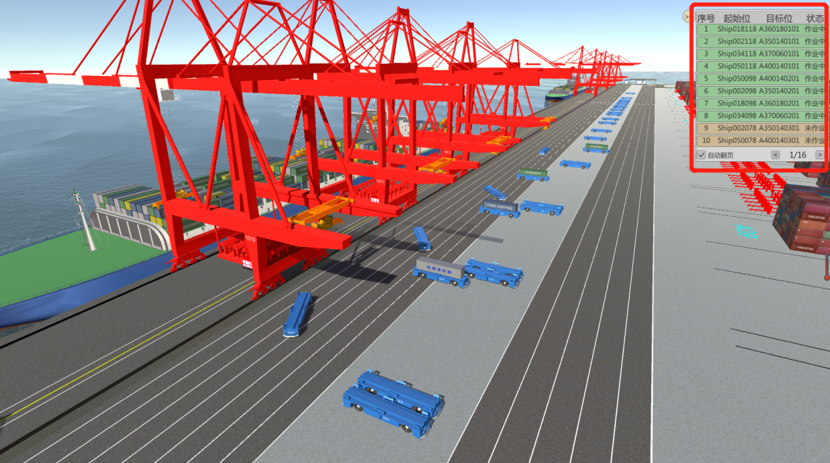 步骤五:完成任务设置后,点击“确定”按钮,进入港口虚拟场景,右上角实时显示作业任务列表对话框,如图4所示。作业任务列表共包括4个字段:序号、船箱位、目标箱位、状态。不同状态作业任务对应不同背景颜色,褐色表示未作业,绿色表示作业中,灰色表示作业完成。