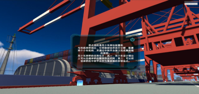 步骤八:点击岸桥等设备设施,弹出当前设备详细说明,同时系统会通过语音功能进行设备信息的介绍,帮助学生了解作业设备功能知识点,如图5所示。